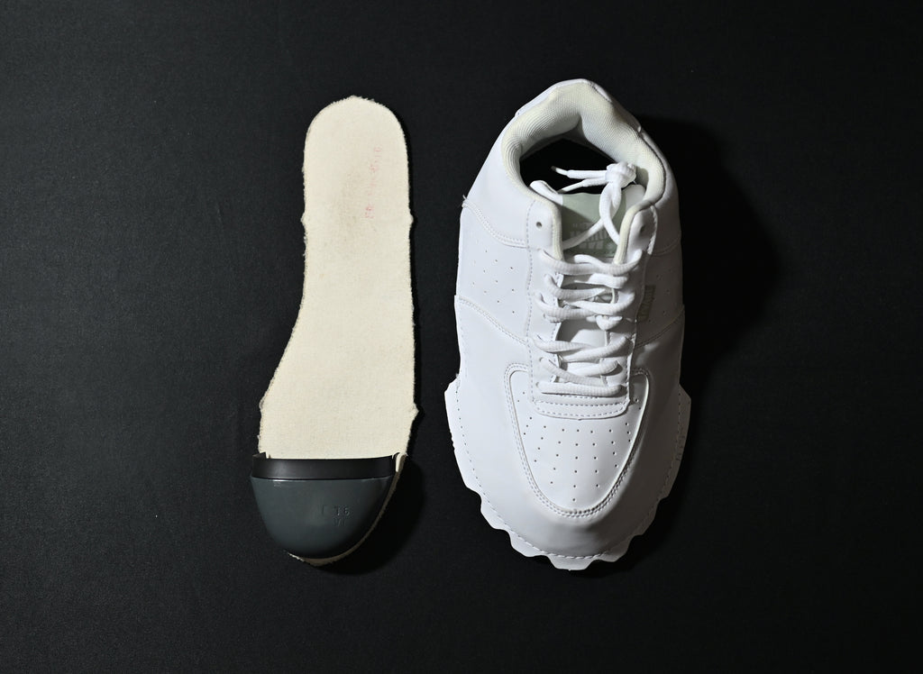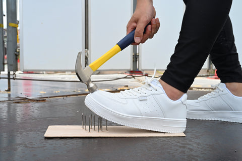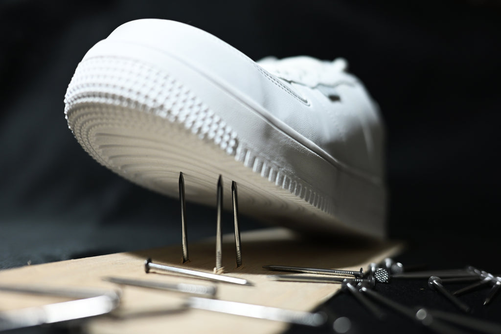 約100kgの重さにも耐える力で、普通の靴で歩いたら、釘やガラス片がソールを貫通し大怪我をしてしまう状況でも、靴裏から足の安全をしっかりと守ります。